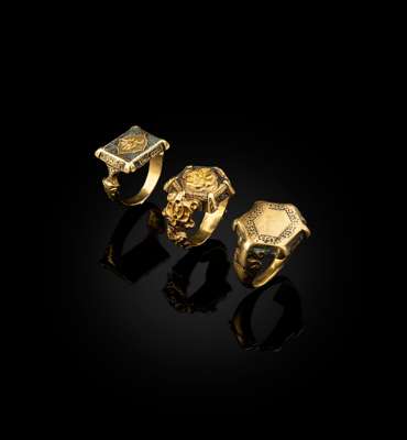 Rings of this type are typical products of the Seljuk period, which are characterised by the tapering shanks, polygonal bezels, inscriptions around the outer edge of the bezel, niello backgrounds, and leafy arabesques in high relief. All these elements are seen on the present rings as well as a fine example in the Metropolitan Museum of Art (inv. no. 2007.344) which is decorated with a resting lion (see S. R. Canby et al, Court and Cosmos: The Great Age of the Seljuqs, The Metropolitan Museum of Art, 2016, p. 103). Rings of this type do not appear to have been common in the Islamic world until the 12th century, although their prototypes are found in Greek and Roman jewellery (see K. Jenkins and M. Keene, Islamic Jewelry in the Metropolitan Museum of Art, The Metropolitan Museum of Art, New York, 1983, p. 61).
