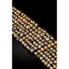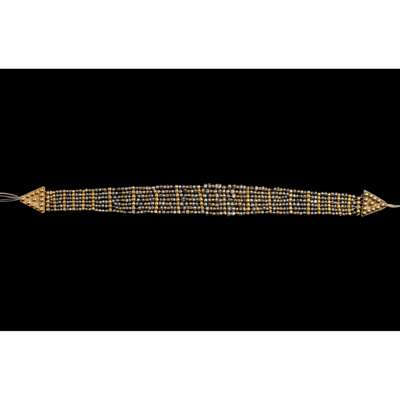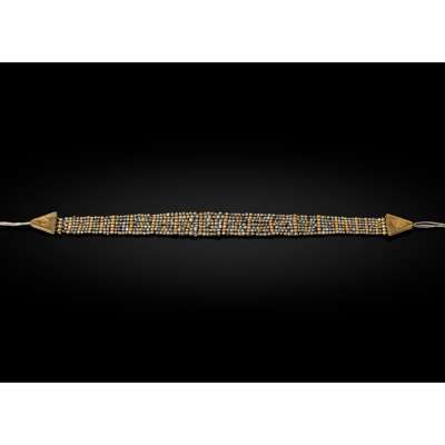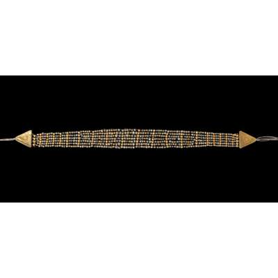 each finial gold element of triangular form with beaded borders and raised circle at centre, strung with seven long rows of spherical and flanged gold beads and natural pearls, later restringing