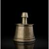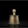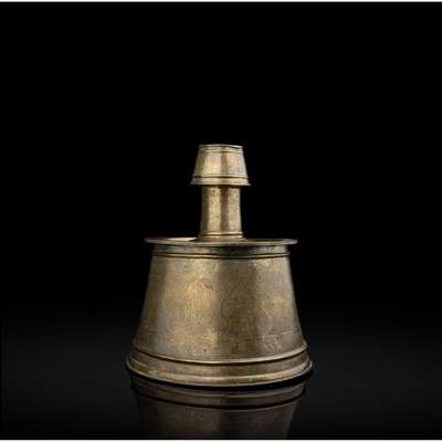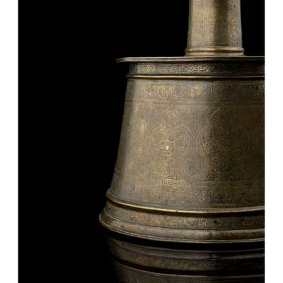 The distinctive tall, slightly tapered drum-shaped body with an overhanging shoulder and horizontal flanges above and below the main decorative field, as well as a socket which parallels the form of the body, first appears in Mosul in the first half of the 13th century. The earliest securely dated candlestick of this type, now in the Museum of Fine Arts Boston (inv. no. 57.148), is signed by Abu Bakr b. al-Hajji Jaldak and dated 622 AH/1225 CE [Rice, D.S., “The Oldest Dated ‘Mosul Candlestick” in The Burlington Magazine, Vol. 91, No. 561 (Dec., 1949), pp. 334, 336-341]. The Boston candlestick, and another in the Khalili Collection (inv. no. MTW 1252), are the only two known candlesticks other than the present example which feature the primary figural imagery set within cusped arches. The Khalili candlestick, which is missing its neck and socket, also carries kufic inscription bands above and below the images on the body which have not yet been deciphered. Although unsigned, it has been attributed to the ‘Mosul School’ of Ahmad al-Dhaki and his student Abu Bakr b. al-Hajji Jaldak [Makariou, S. (ed.), l’Orient de Saladin: l’art des ayyoubides, Éditions Gallimard, 2001, pp. 140-41 cat. 114]. Given the similarities between all three pieces there is good reason to believe that the present candlestick was also made in Mosul around 1225, possibly even in the same workshop as the others.