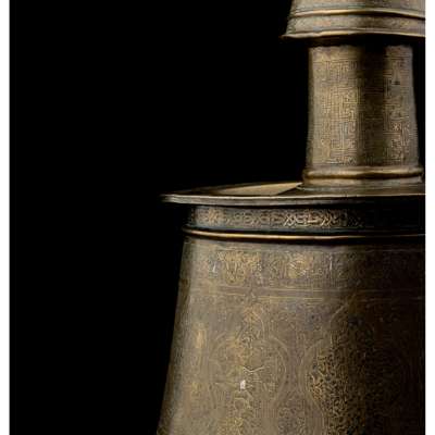 Found in a bric-a-brac market in the south of France and subsequently recognised for its exceptional importance, this candlestick is a rare and fine example of Mosul metalwork from the first half of the 13th century. Not only does it link to key pieces made by important Mosul metalworkers, but it carries vivid and varied iconography as well as a fascinating historical record in its graffito.