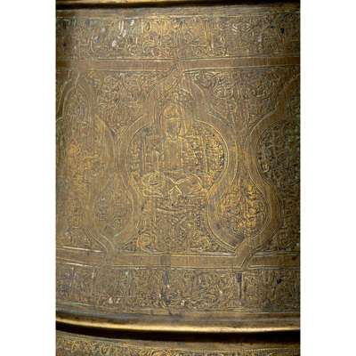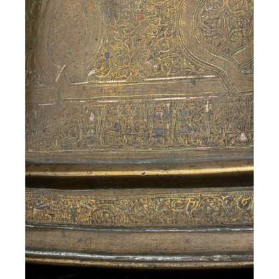 A further point of interest here is the appearance of a graffito beneath the eagle blazon. Engraved in a cursive style typically found on Zangid and Ayyubid metalwork, it gives the name and title of a later owner: al-Faris Aqtaya amir majlis (‘al-Faris Aqtaya, guardian of the [Sultan’s] seat’). Intriguingly, there are two known historical figures with this name from the end of Ayyubid rule and the beginning of the Mamluk period. The first is Faris al-Din Aqtay al-Jamdar, who took part in the murder of al-Mu’azzam Turanshah, the last Ayyubid sultan of Egypt, and was subsequently executed by the Mamluk sultan Aybak in 1254. The second Faris al-Din Aqtay was appointed as atabeg (regent) for Aybak’s eldest son al-Mansur Ali, and became known as al-Musta’rab. Earlier in his career, Faris al-Din Aqtay al-Musta’rab had served Badr al-din Lu’lu’ in Mosul, which provides a possible link to the present candlestick.