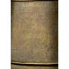 The imagery of the present candlestick is highly unusual, and while some of it is directly comparable to other Mosul metalwork other elements are apparently unique. Six of the arches contain figures. The first is a relatively straightforward enthronement scene, with a ruler seated cross-legged on a raised dais according to the classic medieval Islamic iconography. Below him are two composite animals, one a winged lion and the other with the same body but an eagle’s head. The next figural arch contains a heraldic brachycephalic eagle. Subsequent arches feature a standing, robed figure with hands crossed at their waist, a mounted hunter, two men wrestling, and a scene of relaxation under a tree. The non-figural arches as well as the spandrels are filled with dense, vertically-aligned arabesques.