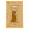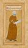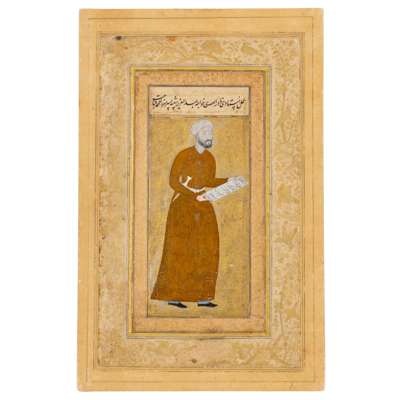 ink, gouache and gold on paper, mounted with borders of gold-decorated pink and cream paper within dark blue and gold margin lines, depicting Mirza-Muhammad wearing a brown robe, holding an inscribed document, a dagger tucked into his white belt, wearing a white turban, above the image a line of nasta'liq in black ink, verso with a handwritten note in English in pencil referring to the Aga-Oglu collection and raqqam numbers in black ink, the back board with a handwritten note by S.C. Welch, a Fogg Museum exhibition label and other labels