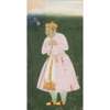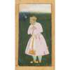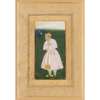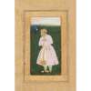 gouache on paper heightened in gold, red, blue and gold margin lines, mounted on to a gold decorated album page, depicting the nobleman facing to the left, his hands folded together leaning on a stick, dressed in a light purple jama over green pantaloons, a dagger tucked into his gold and white patka, verso with diagonal lines in nastal'iq comprising couplets from a ghazal of Hafiz