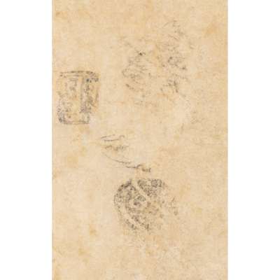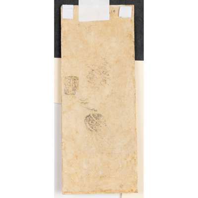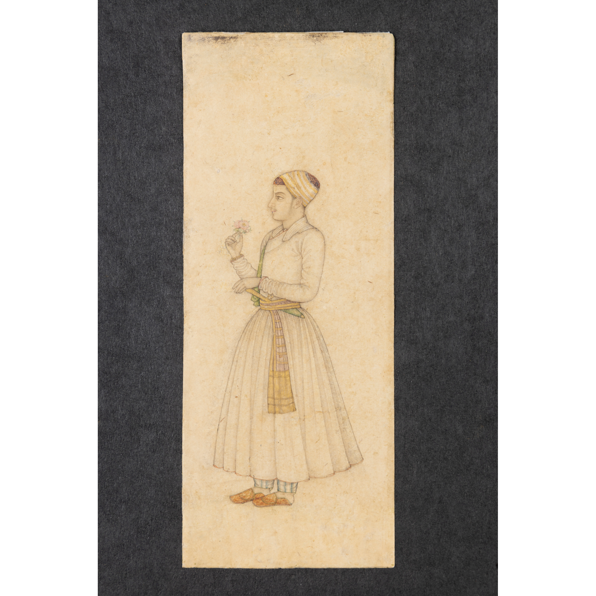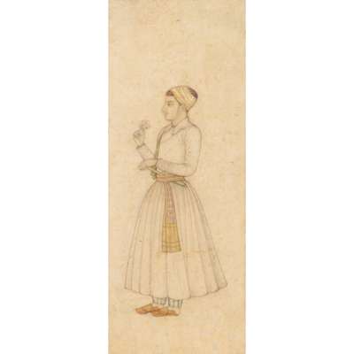 ink, pencil and gold highlights on paper, the prince depicted in profile facing to the left, holding two little roses in his right hand, wearing a jama over striped pantaloons, a dagger tucked into his floral patka, gold embroidered slippers on his feet, verso with seal impressions
