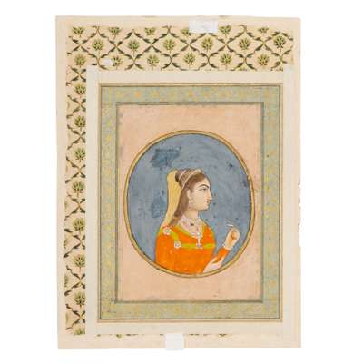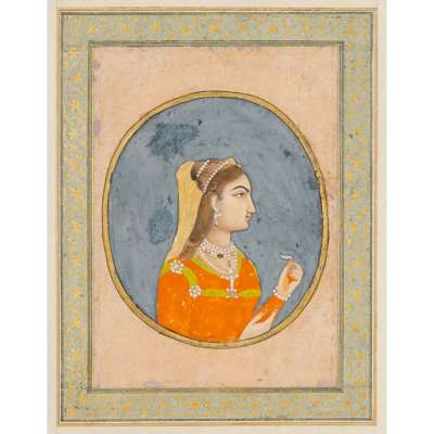 European oil paintings and prints were taken to India during the 16th and 17th centuries by the British and Portuguese. Mughal artists made a practice of painting their own versions of portraits of noble personages, a tradition that was continued on into the 18th century. This particular portrait of a European noble woman with a European coiffure is a fine example of this European influence on Mughal painting.