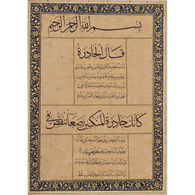 Friedrich Paul Theodor Sarre (1865 - 1945) was a German Orientalist, archaeologist, and art historian known for his extensive collection of Islamic art. Possibly the attraction to this miniature, in addition to the story, is the Arabic calligraphy on the reverse, which would explain why it formed his collection. Sarre also traveled widely throughout the Middle East, collecting artworks - particularly from Persia and Constantinople. His collection was first exhibited in Berlin in 1899 and later in Paris at the Exposition des arts musulmans (1903). He donated most of these works to the Kaiser Friedrich Museum in Berlin, where he served as director of the Islamic Department from 1921 to 1931.