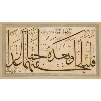 The calligraphy on the reverse of the painting is an Arabic qasida, signed: ‘Abdullah wrote it’.