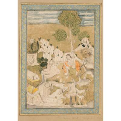 gouache, pen and pencil on paper heightened in gold, light blue and gold floral border, gold and polychrome floral outer border (covered by mount), depicting a well-dressed Layla visiting a gaunt figure of Majnun seated under a tree against a bolster, Layla's camel is in the foreground with an attendant and her trusted dog, surrounded by wild animals including ibex, foxes and birds, amidst a rocky landscape, verso with an elegant line of calligraphy in black ink highlighted in gold comprising an Arabic qasida, within the same light blue and gold floral border, mount inscribed in pencil in German with Kat. No. 327, mounted, glazed and framed