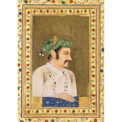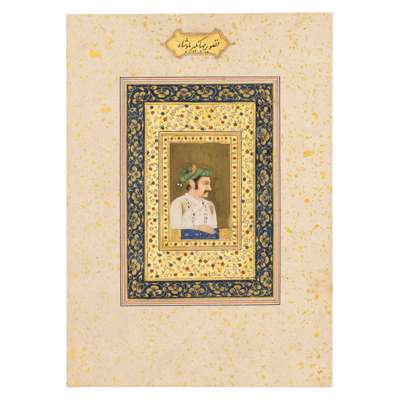 gouache on paper heightened in gold, with blue, red and gold margin lines, floral and gold inner borders, mounted on to an 18th century album page with narrow navy blue and gold floral border with a gold sprinkled outer border, the emperor depicted in profile facing right, one hand resting over the window sill, wearing two strands of pearls, emeralds and rubies, his typical green turban, an identifying inscription-filled cartouche within the outer border, mounted, glazed and framed