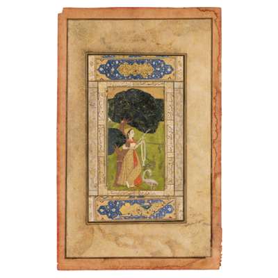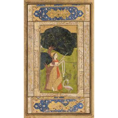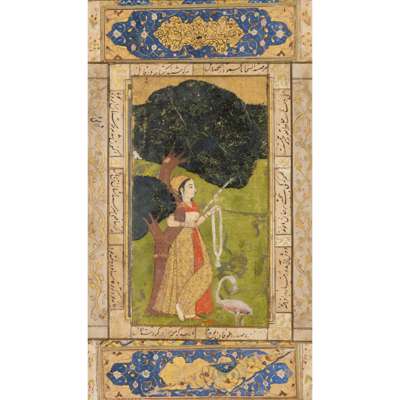 gouache on paper heightened in gold, mounted on to an album page with Safavid illuminated panels and inscription-filled cartouches, depicting a nayika by a tree holding out a garland with a crane at her feet