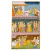 gouache on paper heightened with gold, depicting three scenes from the Bhagavata Purana, life stories of Krishna and Bahram receiving devotees, nagari text in black and red ink on the reverse