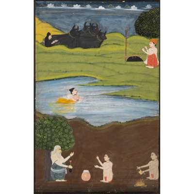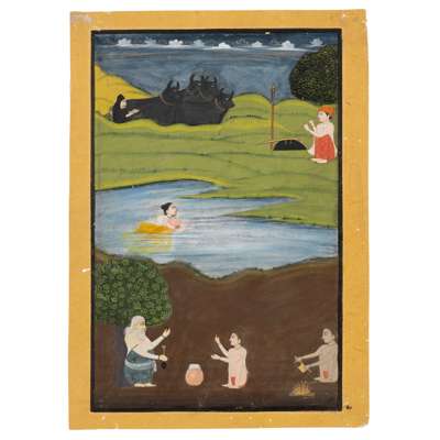 gouache on paper with minor gold highlights, depicting Mahival seated playing the flute with his shield, sword and spear at his side, four buffalos and their herder in the background, Sohini seen swimming across the river using a pot for buoyancy, the foreground depicts the pot makers at work