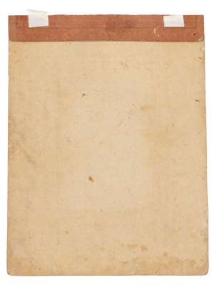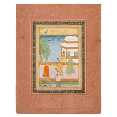 gouache on paper heightened in gold, mounted on to an album page with white and gold margin rules, with gold and dark blue borders, a gold sprinkled outer border, depicting a lady dressed in gold and seated on a black stool, to the right a male courtier dressed in green and gold holding out a garland to her, to the left of her a female attendant holds out a blue and white dish in which she is dipping part of her sash, a tree and palace building behind, four cranes are flying in the sky, an inscription-filled cartouche in gold above with a standing crane