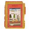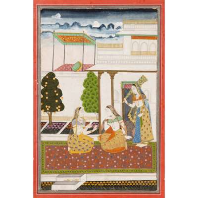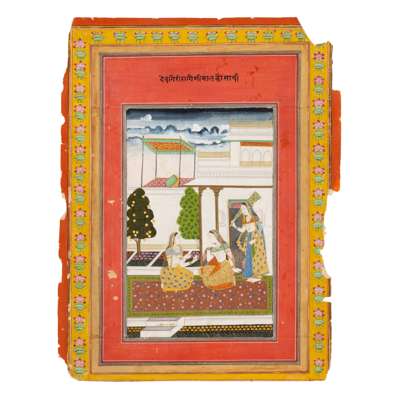 gouache on paper heightened in gold, red border inscribed in nagari script, yellow and green floral outer border, depicting two bejewelled seated ladies in deep conversation with an attendant holding a peacock-feathered chowrie to the right, trees and formal gardens behind and further palace buildings in the background, mounted, glazed and framed