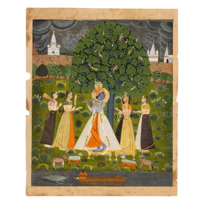 gouache on paper heightened in gold, depicting Krishna playing the flute flanked by two gopis on either side with diminuitive cows at their feet, the tree behind full with monkeys, peacocks and other birds, all on a colourful flowerbed, a tree line above followed by a wall and palace buildings, overlooked by a dark sky with stormy clouds, the foreground depicts the Yamuna river with a barge, mounted, glazed and framed