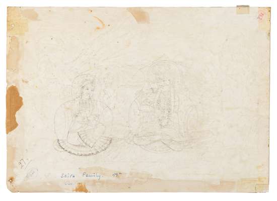 ink and gouache on paper, highlights in gold, depicting Shiva seated with Parvati with their children Kartitikeya and Ganesha standing to either side waving cauris, on a rose covered terrace with a balustrade behind, Nandi and Parvati's lion in the foreground, a further pencil drawing on verso with the two main subjects, mounted, glazed and framed