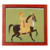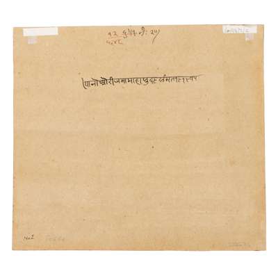 gouache and gold on paper, black margin line, red border inscribed in nagari in black ink, the ruler dressed in a gold jama, a red patka and orange turban, astride his richly caparisoned bay horse, all against a green ground, verso inscribed with one line of nagari script in black ink