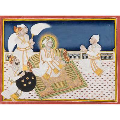 gouache and gold on paper, black and white margin lines, with yellow and red border, depicting a ruler seated against a bolster on a carpet on a terrace with three attendants, his head with a nimbus and bejewelled, a visiting courtier or noble to the right