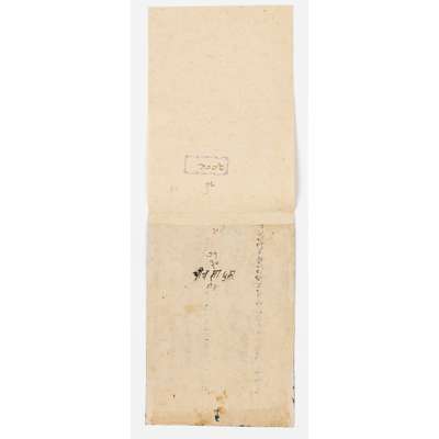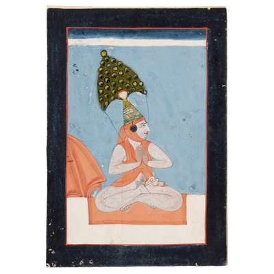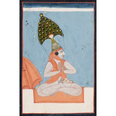 gouache on paper, red margin line, with dark blue border, the cross-legged ascetic on a terrace wearing an elaborate turban of peacock feathers, cover paper with Mandi royal collection stamp on reverse