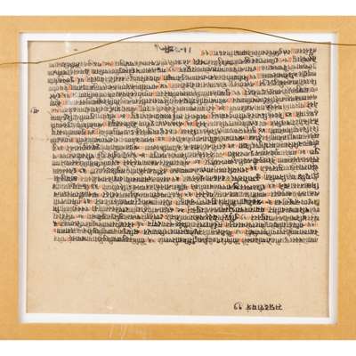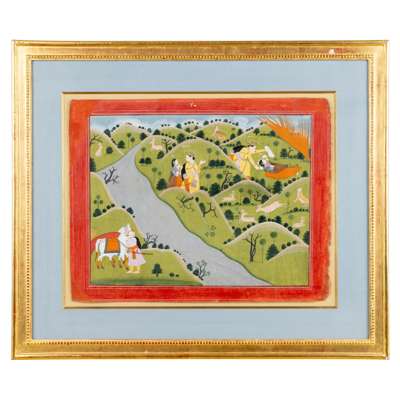 gouache on paper heightened in gold, red border within black and white margin rules, the scene from bottom left depicts Lakshmana's white-horse drawn carriage attended by a groom, across the river, Lakshmana, dressed in yellow with his characteristic crown and bow and arrow, is turning left towards Sita, the upper right hand side shows Laskhmana fanning Sita to sleep, a large red wing can be seen in the upper right hand corner, all against a hilly and wooded landscape with wild deer and tigers, with short inscriptions in black and white ink, twenty-five lines in Sanskrit on the reverse, mounted, glazed and framed