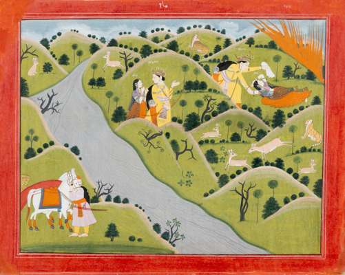 The Nadaun Ramayana is characterised by its large landscape size and bright red border, its hilly and wooded landscape, often portraying a river such as in this example. It is known as Nadaun because it emerged from the Nadaun prinicipality, one leaf of which is in the Himachal State Museum, Simla. Further extent folios are in the Brooklyn Museum (accession number 75.203.2), the Los Angeles County Museum of Art (AC1999.27.45), and the National Museum of New Delhi. Another formed the collection of Jane Greenough Green, see Pleasure Gardens of the Mind: Indian Paintings from the Jane Greenough Green Collection, exhibition catalogue, 1993, no. 15.