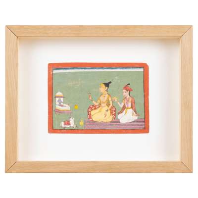 gouache on paper, black margin line with red border, depicting two ladies sitting on a purple and pink carpet, holding offerings and worshipping a lingam shrine with the bull Nandi, on a green ground, mounted, glazed in a box frame