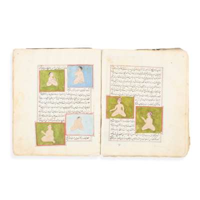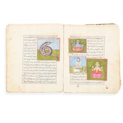 [colophon:] by Ray Satidas, son of Ram Bhai, of the Khatri people [qawm] … copied in Mumbai by Muhammad Baqir … Jumada al-Awwal 1237 AH [i.e. January/February 1832]. Persian manuscript in black ink on wove paper, 43 leaves, (25.7 x 20.6cm), 17 lines to the page, nasta'liq script, rubricated headings and emphasis markings, illustrated with some 40 Indian School miniatures in gouache including depictions of yoga stances and Hindu deities (on pasted-in slips). Bound with a continuation of 2 separate texts both copied by Muhammad Baqir on the same date as the main text and in the same style, these comprising 105 leaves (the volume in total therefore containing 148 leaves), the first additional text containing one miniature. Contemporary leather binding, covers detached, occasional damp-staining, near-contemporary inscription in Persian to initial blank