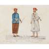 watercolour on card, depicting two officials standing side by side with moustaches holding on to staffs, identifying written inscriptions below each