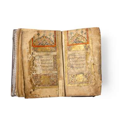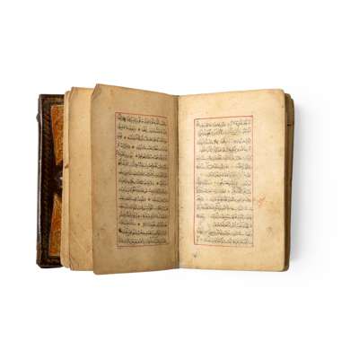 Arabic manuscript on paper, 253 leaves, with double illuminated heading, 15 lines to the page in black naskhi script, margin rules in red, gold rosette verse separators, with contemporary gold embossed binding with its original flap, in a repousse silver case decorated with rocaille