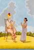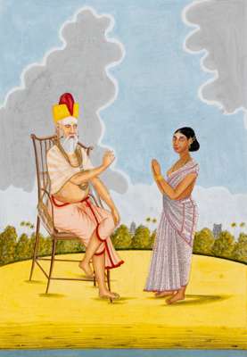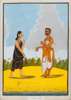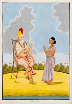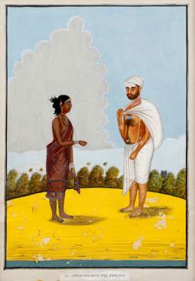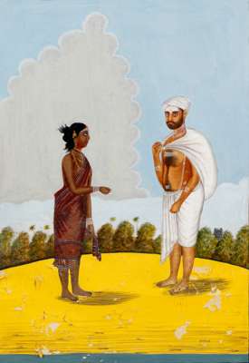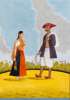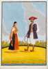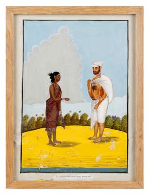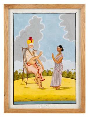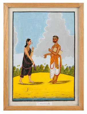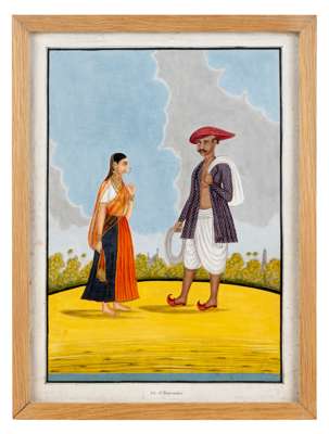 These paintings are charming reflections of life in South India produced by local artists commissioned by the British. They all follow the same format consisting of a green luscious and exotic forest on the horizon with architectural features above a yellow rounded ground below, and the sky with unusually large clouds, acting as the backdrop for two figures, usually a male and female.