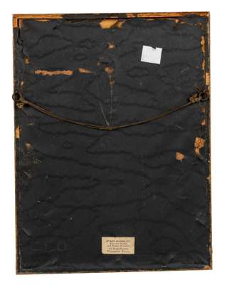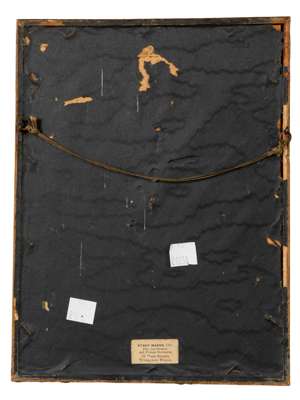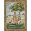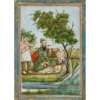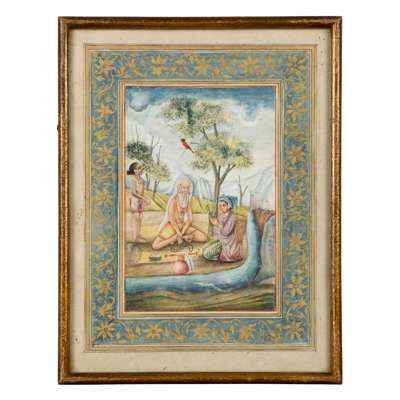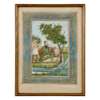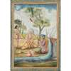 gouache on paper heightened in gold, with red and gold border, and gold decorated blue outer border, depicting various Ragamala scenes within scenic landscapes, glazed and framed