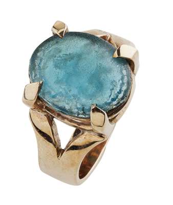 the oval blue glass cabochon intaglio carved to reverse '45', in modern 9ct gold setting