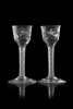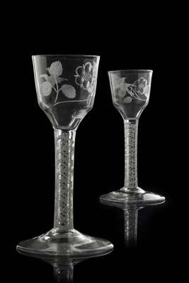 the slightly tapered bucket bowl engraved with displayed rose head and closed bud within trailing leaves, a bird to the reverse, above a straight triple white enamel twisted stem and spreading foot