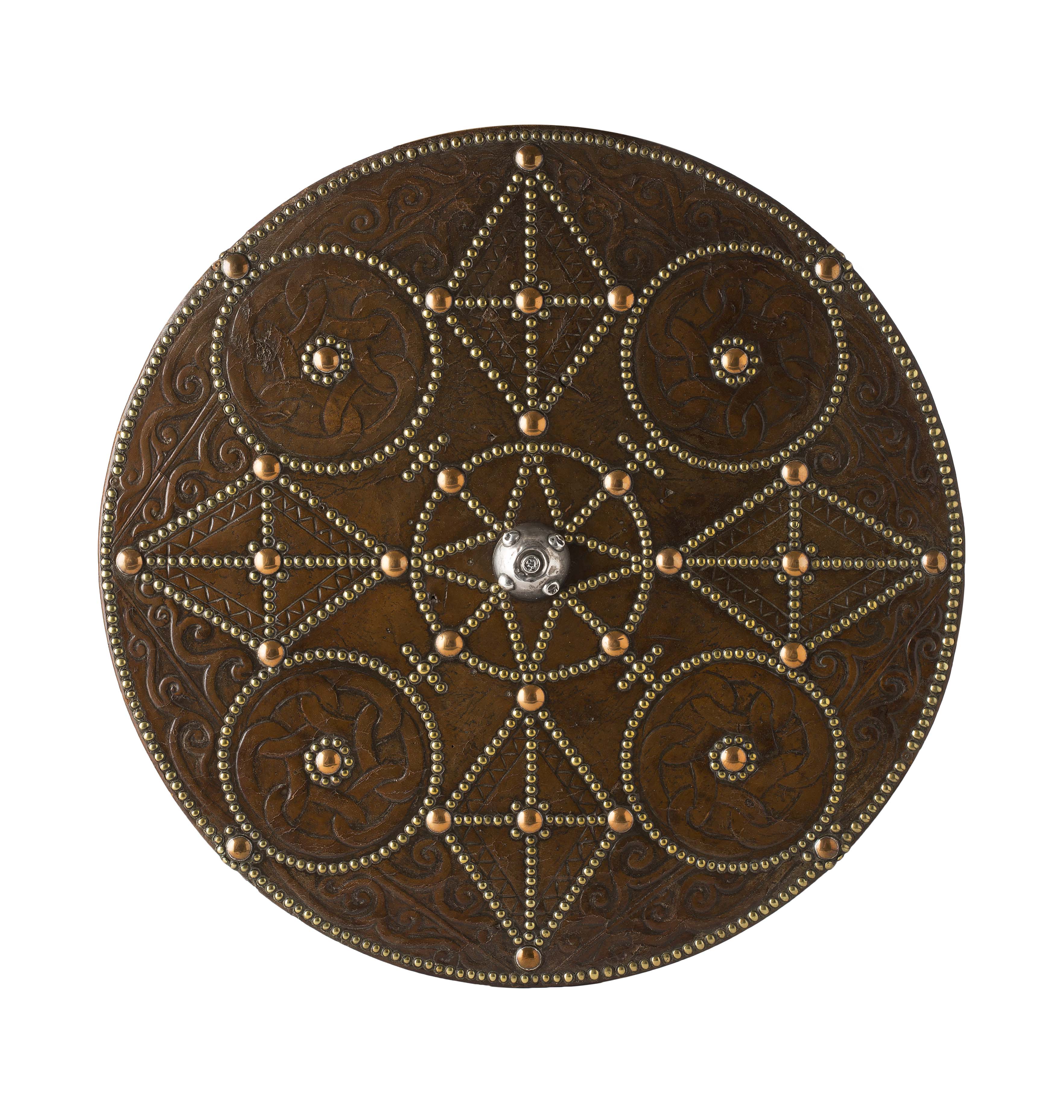 the leather covered wooden circular carcass with a brass domed and studded border enclosing alternating panels of lozenge and circular form, these and the outer borders with tooled Celtic knot work and trailing scrolls, surrounding a central domed and studded silver boss, the reverse with traces of mounting loops