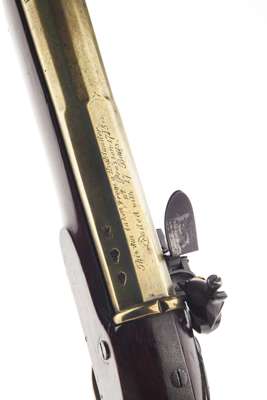 barrel by James Spencer of London, octagonal at the breech ,then polygonal , terminating in three raised lines then round section for fourteen inches to the flared muzzle, struck with gun makers view and proof marks and initials IS surmounted by a crown ,engraved at the breech in contemporary hand "This was taken from a Highlander at Preston 1715 loaded 17 balls " raised ramp cut with a back sight with iron tang , the walnut full stock mounted with brass furniture, trigger guard and heal of the brass butt engraved with martial trophies with union flag, fine deep chequered grip with each section punched with four stars within a cross, mounted with a flintlock circa 1770 signed HW MORTIMER, with its original horn tipped ramrod