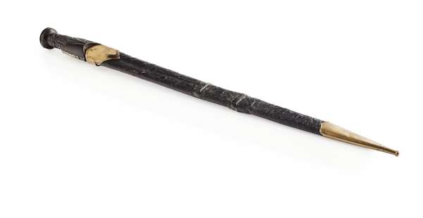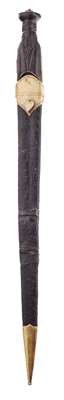 with carved dark hardwood grip with brass mounts and with brass disc top retained with flower head nut, carved with interlace below the shallow pommel, the blade of cut down back sword struck with running wolf, orb and cross marks, in black leather damaged scabbard with brass mounts