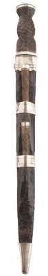 the carved wooden grip with celtic interlace and carved haunches, the haunches and pommel with silver mounts, the tapered blade with plain back edge and spear point, indistinctly marked, the leather scabbard with silver mounts set with bi knife and fork, with basket carved grips and plain caps, the knife blade signed ROBTSORBY & SONS'