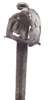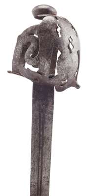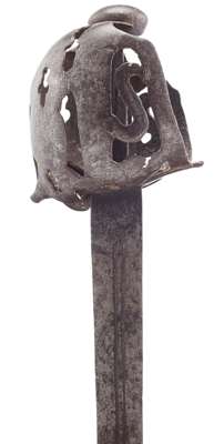 the basket of flat section iron plate formed into saltires with S at each side guard, slight stub wrist guard and neb forward guard with remnant of leather liner, flattened bun shaped pommel, plain double edge blade with two six inch fullers at each ricasso