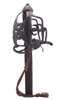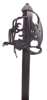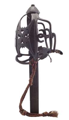 with elongated dark patinated basket formed of round section bars with the side guards pierced with hearts with two S 's forming the back guards at each side with a large wide wrist guard, the spiral wooden grip covered in black dogfish skin missing its binding wire but retaining one scalloped ferrule conical pommel cut in quartered groves, the German double edge blade struck with a running wolf mark of Solingen