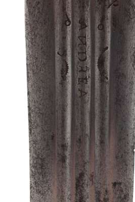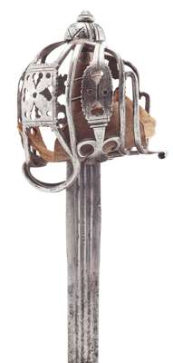 the basket formed of round section bars with grooves, side guards with hearts pierced on each plate, small wrist guard, the pommel cut with grooves, the replacement wooden grip bound with leather, the blade with three long fullers struck FERRARA in the centre groove
