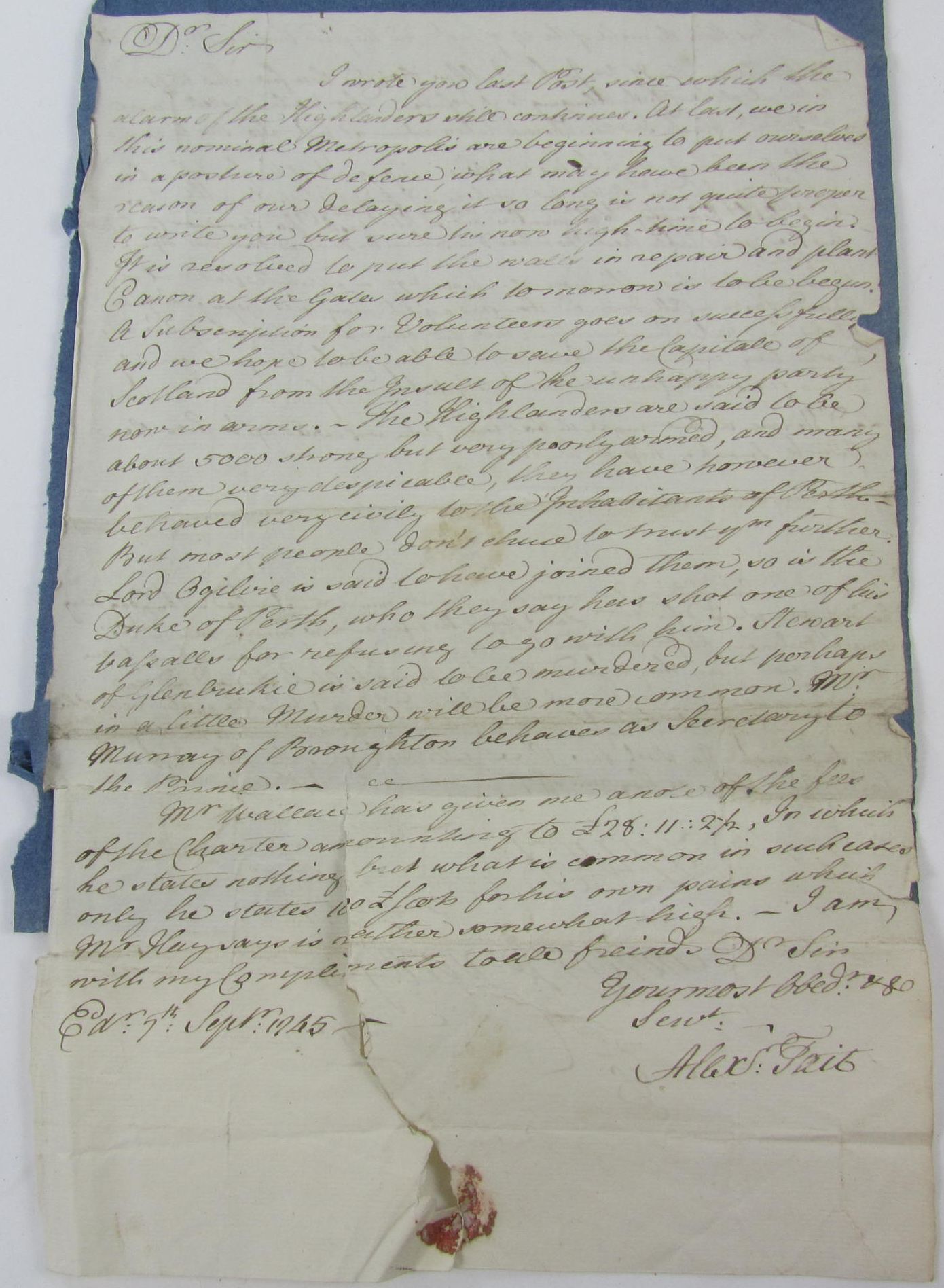 from Alexander Tait, stating "the alarm of the Highlanders still continues.. we are beginning to put ourselves in a posture of defence", noting an unaccountable slowness to do this, "resolved to put the walls in repair and plant canon at the Gates", noting that "The Highlanders are said to be about 5000 strong but very poorly armed, and many of them very despicable, they have however behaved very civilly to the inhabitants of Perth", noting that Lord Ogilvie and the Duke of Perth have joined them, and reporting the murder of Stewart of Glenbuckie, 1 page, Edinburgh, 7 Sept, 1745; and a typed list of Relics purchased by the clan Macpherson on 3rd May 1943, 4pp. (2)