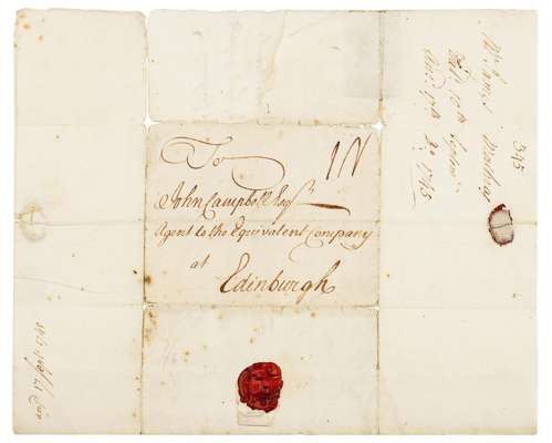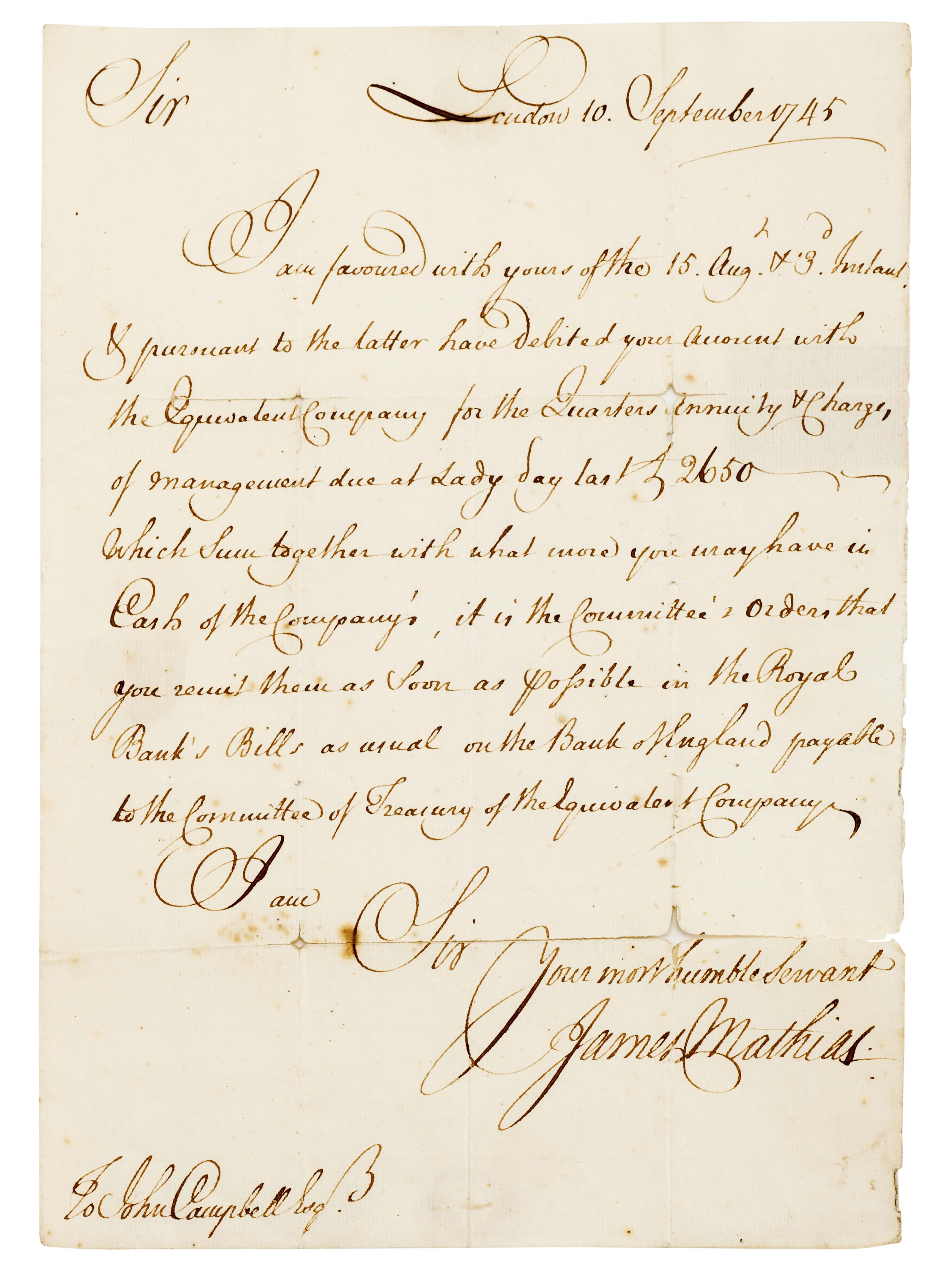 Letter from James Mathias [secretary of the Equivalent Company] to John Campbell, regarding payments, written on one side of folded notepaper with address and seal to verso, page dimension 23 x 19cm, dated London 10. September 1745 (note states that the letter was answered on 17th September 1745)