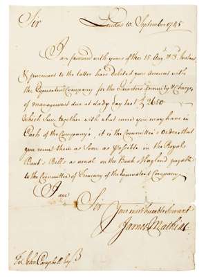 It was on this day, 17th September, that Campbell replied to James Mathias's letter. In the letter sent to John Campbell, Mathias states that he has debited Campbell's account with the Equivalent Company, "...for the quarter annuity and charge of management..." and asking that he remits the Company, "...as soon as possible in the Royal Bank's Bills as usual...payable to the Committee of Treasury of the Equivalent Company."