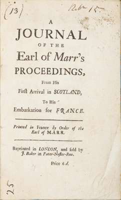 A journal of the Earl of Marr's proceedings, from his first arrival in Scotland, to his embarkation for France. London: J.Baker, [1716?]. Second edition, 8vo, modern half calf, [ESTC T69397 listing 8 copies in libraries in the British Isles and 1 copy in a North American library]; [Defoe, Daniel] A trumpet blown in the north, and sounded in the ears of John Erskine, call'd by men of the world, Duke of Marr. By a ministering friend of the people call'd Quakers. [Glasgow:] Henry Luke, 1715. 8vo, modern half calf, darkening to pages [Rare: ESTC T177253 listing only one copy in a library in the British Isles and another in a North American library] (2)