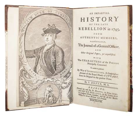 The history of the rebellion in the year 1715. London: James Roberts, 1745. Fourth edition, 8vo, repairs, later panelled calf, rebacked with modern spine, spotting, some loss to text on p.232 and final leaf [ESTC T1958]; Boyse, S. An impartial history of the late rebellion in 1745. Reading: J. Robinson, 1748. 8vo, portrait, 2 maps (one folding), 2 plans, errata leaf, contemporary half calf, rubbed, bookplate [ESTC T83111, listing 9 copies of this variation] (2)