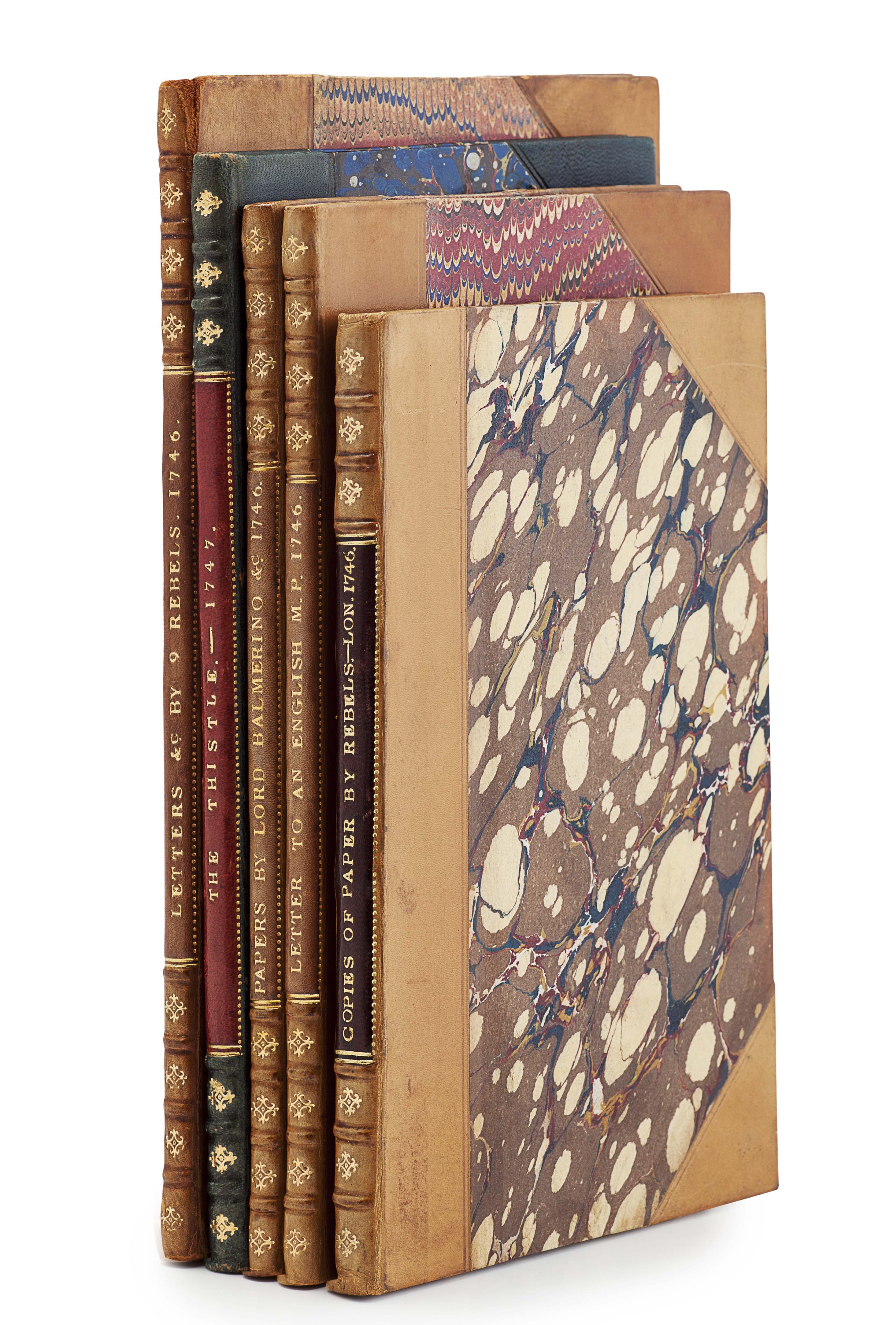 True copies of the papers wrote by Arthur Lord Balmerino [and others]. [London, 1746?] 8vo, modern half calf gilt [ESTC T51840]; [Idem] True copies of the papers wrote by Arthur Lord Balmerino [and others]. London, 1746. 8vo, modern half calf, lacking pp.35-38 in second part [ESTC T51841]; [Griffiths, Ralph] Authentic copies of the letters and other papers delivered, at their execution, by the nine rebels... London: sold by the publishers and pamphlet-sellers, [1746]. 8vo, modern half calf gilt, hole to p.24 with slight loss to letters; [Willison, John] A letter to an English member of Parliament, from a gentleman in Scotland... London: M. Cooper, 1746. 8vo, modern half calf gilt [ESTC T67599]; [Mansfield, William, Earl of Murray] The thistle... London: H. Carpenter, 1747. 8vo, modern blue half calf [ESTC T50150] (5)