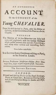 An authentic account of the conduct of the young chevalier. From his first arrival in Paris, after his defeat at Culloden, to the conclusion of the peace at Aix-la-Chapelle. Londod [sic.]: Nutt, Dodd [&] Barnes, 1749. Second edition, 8vo, half-title [ESTC N43377 listing only one copy of this printing in libraries in the British Isles and one in a Canadian library]; [bound with] Burton, John A genuine and true journal of the most miraculous escape of the Young Chevalier... London: W. Webb, 1749. 8vo [ESTC T40754]; [bound with] Pasquin and Marforio on the peace... London: W. Webb, [1748]. Second edition, 8vo, half-title [ESTC T43732]; contemporary calf rebacked