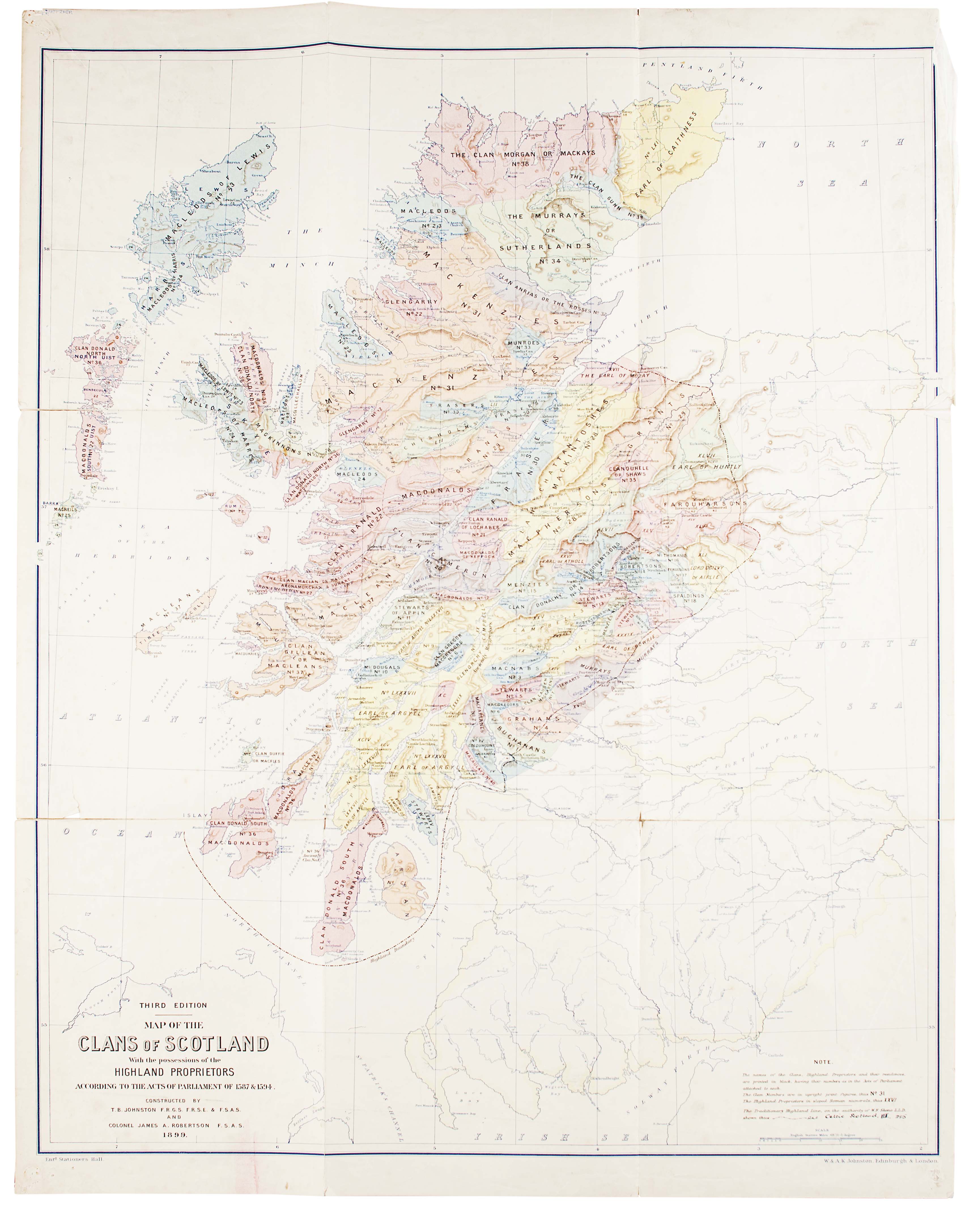 A historical and genealogical essay upon the family and surname of Buchanan. Glasgow: printed by William Duncan, 1723. First edition, small 4to, engraved plate torn with loss and laid-down, pp.107-8 torn with some loss [ESTC T154470]; Arnot, Hugo The history of Edinburgh. Edinburgh/London: W. Creech/ J. Murray, 1779. 4to, frontispiece, folding map of Edinburgh, contemporary calf gilt with tooling to spine and 'XS' with a crown in gilt to upper cover, joints split [ESTC T142880]; Johnston, T.B. - Robertson, James A. Historical geography of the clans of Scotland. Edinburgh and London: W. & A.K. Johnston, 1899. 4to, loose linen-backed folding map, original red cloth gilt; Kilgour, Wm. T. Lochaber in war and peace. Paisley: Alexander Gardner, 1908. 8vo, modern quarter calf (4)
