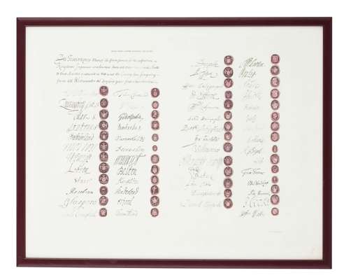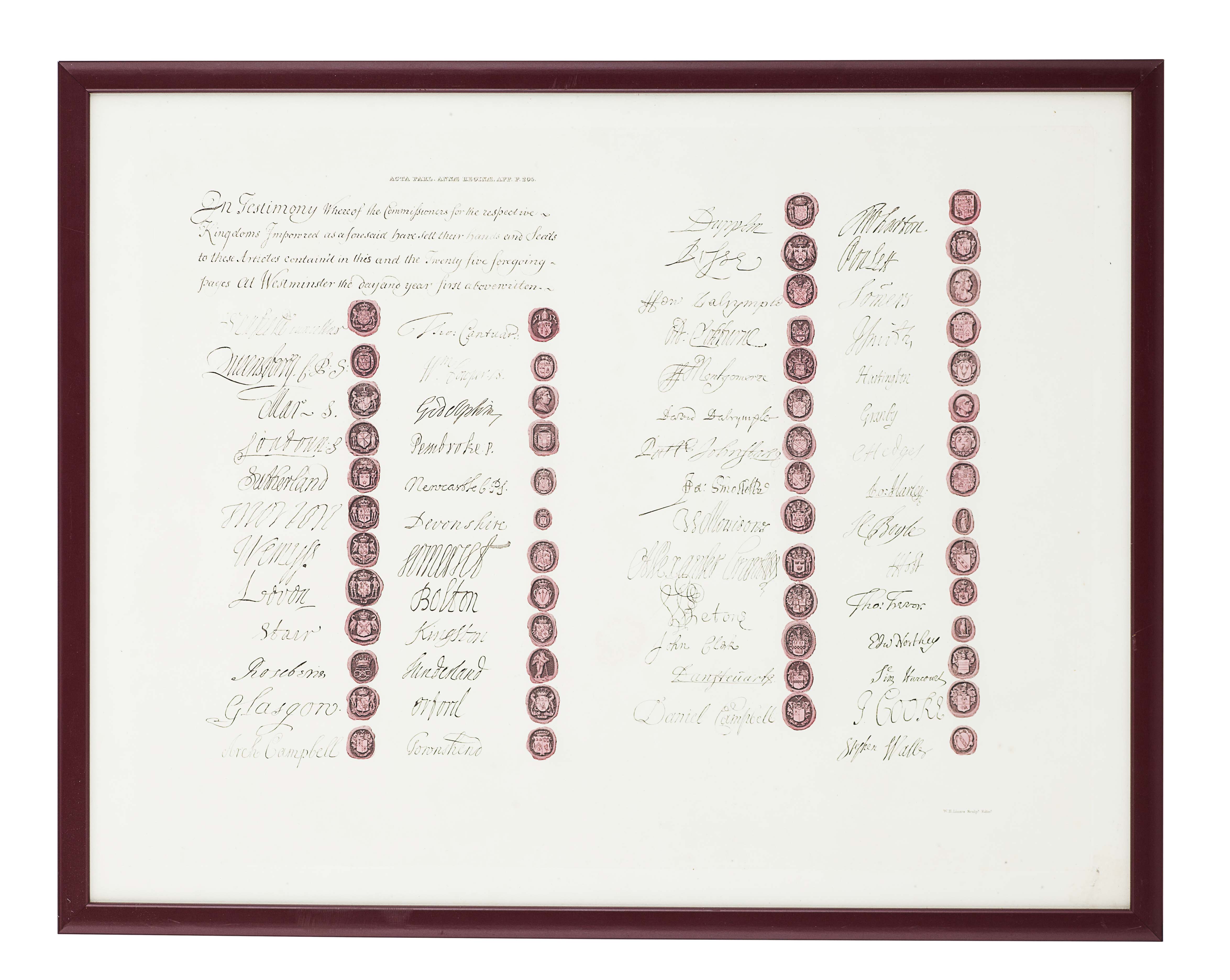 The signatures and seals of the English and Scottish commissioners for the Treaty of Union, signed 22 July 1706, facsimile engraved by William Home Lizars, c.1815, and printed subsequently Edinburgh: c.1825 (watermark J. Whatman 1825), hand-coloured seals, framed and glazed, c.52 x 65cm including frame